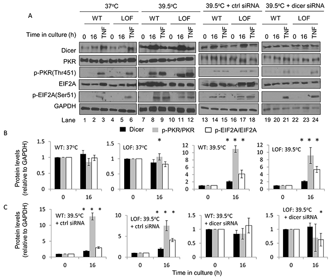 Figure 5: The role of dicer in influencing PKR and eIF2α phosphorylation during mild (39.5°C) hyperthermia-induced thermotolerance is likely distinct from its role in microRNA processing. (A) Western blot analysis of dicer, total and phosphorylated PKR, total and phosphorylated eIF2α and GAPDH in WT and dicer LOF MEFs at 0h and 16h at 39.5°C under untransfected (lanes 1-12), control-transfected (lanes 13-18), and dicer knockdown (lanes 19-24) conditions. (B) Protein band intensities in (A: lanes 1-12) were first normalized to GAPDH band intensities corresponding to that specific protein and further normalized to the 0h time points in the respective experimental group. (C) Band intensities in (A: lanes 13-24) were analyzed by the same method described in (B). The ratios of phosphorylated to total proteins in (A) are graphed in (B) and (C). The representative western blot images for GAPDH correspond to the western blot image for dicer this figure. Values shown are mean ± SEM. n = 3, *p < 0.05.