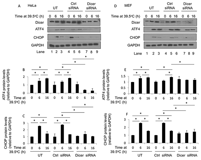 Figure 6: Elevated dicer protein levels observed during mild (39.5°C) hyperthermia-induced thermotolerance influence ATF4 and CHOP protein levels in HeLa and MEF cells. (A) Western blot analysis of dicer, ATF4, CHOP and GAPDH protein levels in HeLa cells at 39.5°C for 0h, 6h and 16h under untransfected (UT), control-transfected (Ctrl siRNA), and dicer knockdown (dicer siRNA) conditions. (B) ATF4 band intensities in (A) were first normalized to GAPDH band intensities corresponding to ATF4 (not shown) and further normalized to the 0h value in the untransfected group. (C) CHOP band intensities in (A) were first normalized to GAPDH band intensities corresponding to CHOP (not shown) and further normalized to the 0h value in the untransfected group. (D) Western blot analysis as described in (A) conducted in MEF cells (E). ATF4 band intensity analysis as described in (B) conducted in MEF cells (F). CHOP band intensity analysis as described in (C) conducted in MEF cells. The representative western blot images for GAPDH correspond to the western blot image for dicer this figure. Values shown are mean ± SEM. n = 3, *p < 0.05.