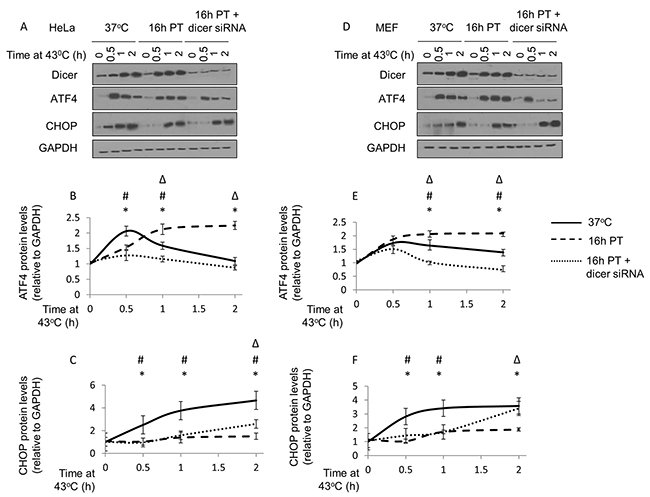 Figure 7: Elevated dicer protein levels observed during mild (39.5°C) hyperthermia-induced thermotolerance is associated with a pro-survival phenotype in HeLa and MEF cells. (A) Western blot analysis of dicer, ATF4, CHOP and GAPDH protein levels in control (37°C), mild hyperthermia (39.5°C) pretreated (16h PT), and mild hyperthermia pretreated dicer knockdown (16h PT + dicer siRNA) HeLa cells challenged with a heat shock (43°C) insult for 0, 0.5, 1 and 2h. (B) ATF4 band intensities in (A) were first normalized to GAPDH band intensities corresponding to ATF4 (not shown) and further normalized to the 0h time point in the control (37°C) group. Statistically significant (p<0.05) differences between control and 16hPT (*); control and 16hPT + dicer siRNA (#); and 16hPT and 16h PT + dicer siRNA (Δ) are displayed. (C) CHOP band intensities in (A) were first normalized to GAPDH band intensities corresponding to CHOP (not shown) and analyzed as described in (B). (D) Western blot analysis as described in (A) conducted in MEF cells. (E) ATF4 band intensity analysis as described in (B) conducted in MEF cells. (F) CHOP band intensity analysis as described in (C) conducted in MEF cells. The representative western blot images for GAPDH correspond to the western blot image for dicer in this figure. Values shown are mean ± SEM. n=3, *p<0.05 (37°C v/s 16hPT), #p<0.05 (37°C v/s 16hPT + dicer siRNA), Δp<0.05 (16hPT v/s 16hPT + dicer siRNA).
