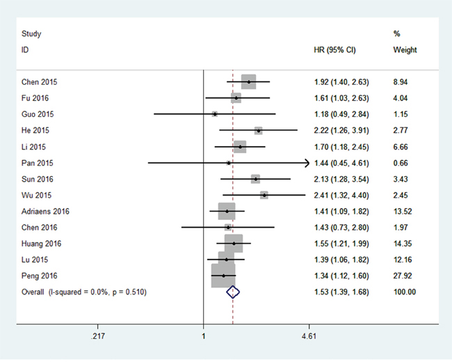 As shown on Figure 1, 163 studies were found in the 5 databases (PubMed, EMBASE, Cochrane Library, Wiley Online Library and Medline). We reviewed the titles and abstracts, and 49 irrelevant studies and duplicates were excluded. Of the remaining 99 studies, 86 were eliminated because they used different statistics methods, were animal experiments, or were not in English. After data extraction, 13 studies [14–26], all from China, were selected for the final meta-analysis with a total of 1,496 cancer patients. The main characteristics are summarized in Table 1. The 13 studies covered 9 different types of cancer, including ovarian cancer (n=2), colorectal cancer (n=3), non-small cell lung cancer (NSCLC; n=2), gastric cancer (n=1), hepatocellular carcinoma (n=1), glioma (n=1), nasopharyngeal carcinoma (NPC; n=1), pancreatic cancer (PC; n=1) and esophageal squamous cell carcinoma (n=1). Among the 13 studies, 12 involved tissue collection, and 1 involved a whole blood analysis. All of the detection methods used quantitative polymerase chain reaction.