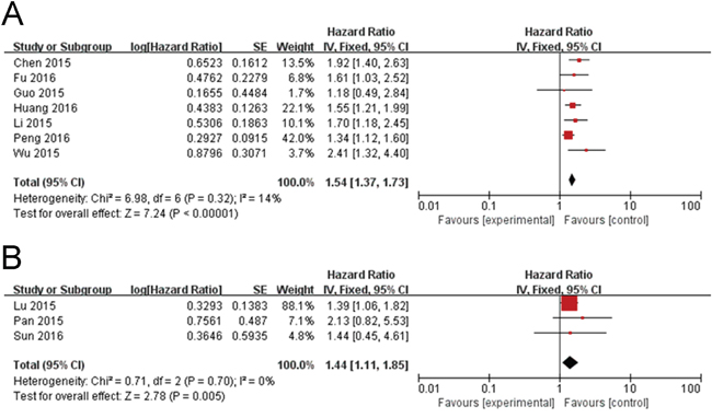 All data information of eligible studies included the first author’s name, publication year, study regions, sample size, cancer type, tumor size, TNM stage, and method of NEAT1 testing. The HR, corresponding 95% CI, and HR statistics for outcome (OS and progression-free survival [PFS]) were calculated independently.