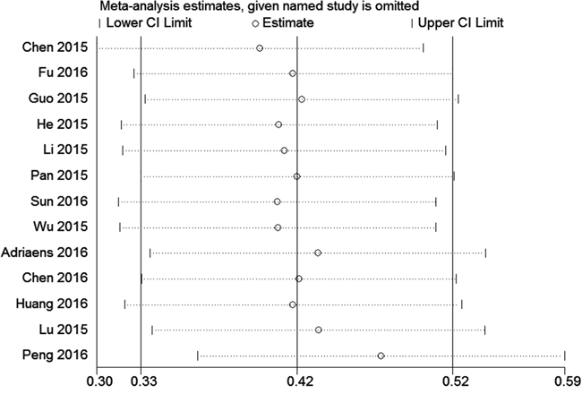 Figure 6: Sensitivity analysis of the effect of the individual study on the pooled HRs for the correlation between NEAT1 expression and overall survival (OS).