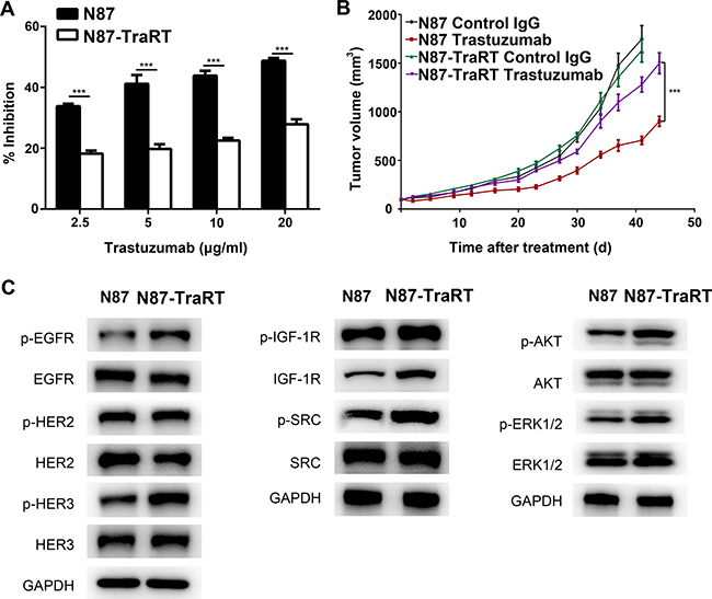 Figure 1: Establishment of trastuzumab-resistant gastric cancer cell line NCI-N87-TraRT. (A), NCI-N87 and NCI-N87-TraRT cells were treated with an increasing concentration of trastuzumab for 5d. Cell proliferation was then determined by CCK8 assay. Results are shown as the inhibition rate of cell proliferation. Error bars, SD. ***P < 0.001; unpaired Student’s t-test. (B), Tumor volume of NCI-N87 and NCI-N87-TraRT tumor xenografts after 4-week treatment with control IgG (10mg/kg, twice a week, intravenously) and trastuzumab (10 mg/kg, twice a week, intravenously). Data are shown as means ± SEM. ***P < 0.001, Mann-Whitney test. (C), Immunoblots comparing major cell signaling changes between NCI-N87 and NCI-N87-TraRT cell lines. Every experiment was repeated 3 times.