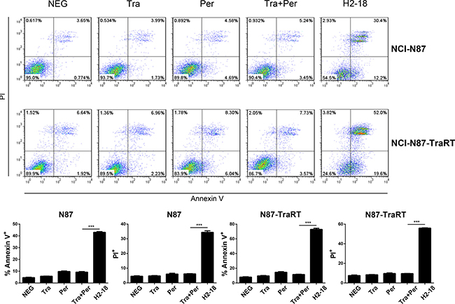 Figure 4: H2-18 potently induces cell death in both NCI-87 and NCI-N87-TraRT cell lines. Cell death induced by control IgG, trastuzumab, pertuzumab, trastuzumab plus pertuzumab, and H2-18 in NCI-N87 and NCI-N87-TraRT cell lines was measured by flow cytometry using Annexin V/PI detecting kit. Every experiment was repeated 3 times. Error bars, SD. ***P < 0.001; unpaired Student’s t-test.