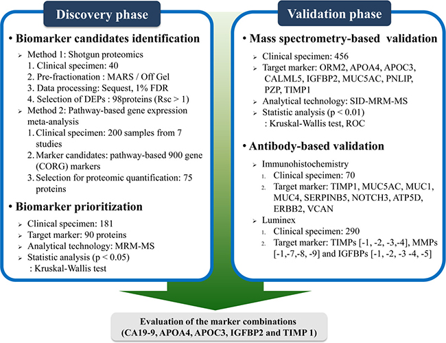 Figure 1: Brief workflow of pancreatic cancer associated-biomarker mining. In the biomarker discovery phase, a shotgun proteomics approach and pathway-based gene expression meta-analysis were performed to identify potential biomarkers for early pancreatic cancer diagnosis. Ninety MRM assays were established and performed on 182 clinical samples. These proteins were prioritized according to statistical evidence (P values ≤ 0.05), and nine proteins were chosen for the biomarker validation phase. The serum levels of these proteins were determined on 456 clinical specimens using SID-MRM-MS. Additionally, immunohistochemistry staining of nine proteins was performed on 70 patient-derived pancreatic tissues. Levels of TIMP-1, -2, -3 and -4, MMP-1,-7,-8 and -9, and IGFBP-1, -2, -3 -4 and -5 were determined for 290 clinical specimens using Luminex. Based on the results, APOA4, APOC3, IGFBP2 and TIMP1 were selected for biomarker panel generation, in combination with CA 19-9.