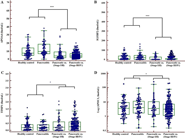 Immunohistochemical staining and Luminex-based biomarker multiplex assays were additionally performed to support our findings from the discovery phase. IHC staining of 9 proteins, including TIMP1, MUCs, and VCAN, was performed on 210 pancreatic tissue lesions and a multiplex assay for TIMP-1, -2, -3 and -4, MMP-1,-7,-8 and -9, and IGFBP-1, -2, -3 -4 and -5 was performed on 220 patient sera samples.