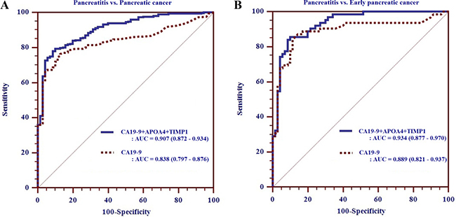 Figure 3: Receiver operating characteristic curve analysis of biomarker panel composed of CA19-9, APOA4 and TIMP1 for pancreatitis versus pancreatic cancer (A) and early pancreatic cancer (B) in the validation phase.