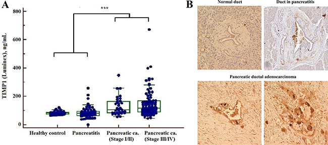 Figure 4: Determination of TIMP1 by Luminex assay (A) and immunohistochemistry staining (B) (***P < 0.001): The serum levels of TIMP1 were increased in PC compared with healthy controls and pancreatitis by Luminex. TIMP1 expression was absent in pancreatic duct of normal and chronic pancreatitis, but was increased in pancreatic ductal adenocarcinoma by immunohistochemistry staining.