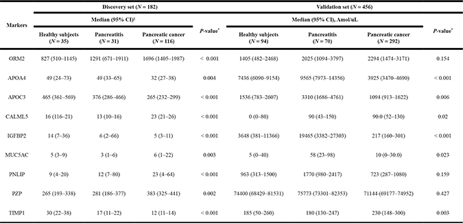 We enrolled 182 specimens (116 PCs, 31 cases of pancreatitis, and 35 healthy controls) and 456 specimens (291 PCs, 70 cases of pancreatitis, and 94 healthy subjects) for the discovery and validation set, respectively. All serum specimens were obtained by centrifugation of blood at 2,330 × g for 5 min and stored at −70°C for further proteomic analysis. For additional antibody-based validation, we used pancreatic duct tissues from 70 individuals for immunohistochemical staining (IHC) and serum specimens from 220 individuals for Luminex analysis.