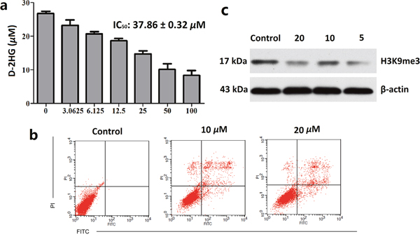 To further understand the mechanism of clomifene-induced cell growth inhibition and apoptosis, we next investigated whether the histone methylation in cells could be affected. As mentioned above, D-2HG is an inhibitor of histone demethylases, which are α-KG-dependent dioxygenases [16]. Consequently, D-2HG may cause global methylation of histones. After treated with clomifene for 48 hours, histone proteins were extracted and methylation level of H3K9me3 was measured by western blot analysis [17]. As shown in Figure 2c, clomifene could markedly decrease the level of histone methylation in HT1080 cells with a dose-dependent manner. These results suggested that clomifene could restore the activities of histone demethylases and avoid the wide hypermethylation of histones, as the result of reducing the concentration of D-2HG.