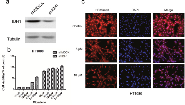Figure 3: Knocking down IDH1R132C attenuates the inhibitory effect of HT1080 cell growth by clomifene. (a) Expression level of IDH1 in HT1080 cells is decreased by knockdown of IDH1. HT1080 cells were transiently transfected with shMOCK or shIDH1 and cell lysates were analyzed by western blot. (b) Clomifene has less effect on cell growth of shIDH1 transfected cells than that of shMOCK cells. (c) Mutant IDH1-mediated H3K9me3 was substantially decreased dose dependently with clomifene treatment.