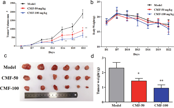 Figure 4: Effect of Clomifene(CMF) on fibrosarcoma cancer growth in an HT1080 xenograft mouse model. (a) The average tumor volume of vehicle-treated control mice (n = 6) and clomifene treated mice (n = 6, 50 or 100 mg/kg per day via gavage) plotted over 21 days after tumor cell injection. (b) Clomifene has no effect on mouse body weight. (c, d) After 2 weeks’ treatment, differences in tumor size and weight are shown. The asterisk * indicates a significant increased tumor size (P < 0.05) in the vehicle-treated group compared with the clomifene-treated group as determined by one-way analysis of variance.