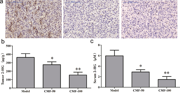 Figure 5: Clomifene (CMF) suppresses IDH1 activity in vivo. (a) Immunohistochemical analysis for the H3K9me3 antibodies was analyzed using mouse tumor samples. The magnification of representative photographs for the immunohistochemistry staining is 400×. (b, c) Clomifene inhibits D-2HG production in serum and tumor tissues.