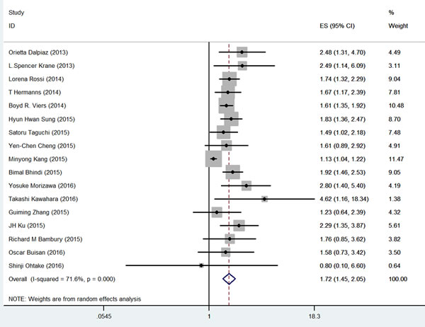 The association between NLR and OS was evaluated in 17 cohorts that included 4,432 patients. The OS of the patients with high pretreatment NLR was significantly poorer than that of the patients with low NLR (HR = 1.72, 95% CI = 1.45-2.05; Figure 2 and Table 1). Significant heterogeneity among these studies was observed (I2 = 71.6%, p < 0.001). Thus, pooled analyses were performed using a random-effect model.