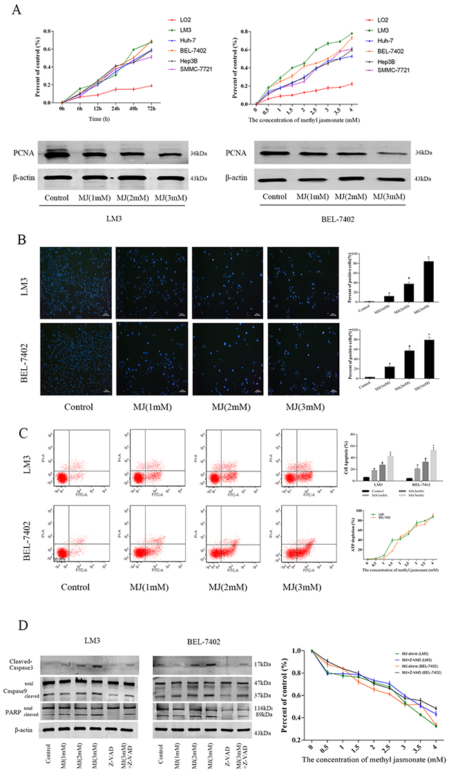 Figure 2: The effects of methyl jasmonate on HCC cells. (A) Normal liver cells (LO2) and HCC cells (LM3, Huh-7, BEL-7402, Hep3B and SMMC-7721) were treated with MJ (0-4 mM) for 6–72 h. The CCK8 kit was used to monitor cell proliferation (n=3). The protein levels of PCNA were detected by western blot. (B) Nuclear fragmentation of LM3 and BEL-7402 cells was observed by fluorescence microscopy and Hoechst 33342 dye after treatment with MJ for 48 h (magnification 200 ×). The number of positive cells was calculated using Image-Pro Plus software 6.0 (n=6). (C) Apoptosis of LM3 and BEL-7402 cells was determined by flow cytometry. ATP depletion was measured by ATP detection kits. (D) The protein levels of Caspase-3, Caspase-9 and PARP were determined by western blot. Percent of control was recorded after Z-VAD-FMK treatment (n=3). The data are expressed as the mean±SD [*P<0.05 for MJ (1 mM) versus Control, #P<0.05 for MJ (2 mM) versus MJ (1 mM), and ^P<0.05 for MJ (3 mM) versus MJ (2 mM)].