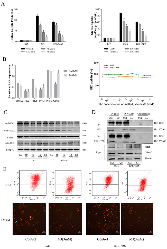 Figure 3: The effects of methyl jasmonate on glycolysis level in HCC cells. (A) Normal liver cells (LO2) and HCC cells (LM3 and BEL-7402) were treated with MJ (0–3 mM) for 48 h. Lactate production and glucose uptake were analyzed and are shown as the mean±SD. [n=6, *P<0.05 for MJ (1 mM) versus Control, #P<0.05 for MJ (2 mM) versus MJ (1 mM), and ^P<0.05 for MJ (3 mM) versus MJ (2 mM)]. (B) The mRNA expression of HK2, PFK, PKM, GLUT1 and LDH was determined using real-time PCR. HK2 activity in LM3 and BEL-7402 was measured after treatment with MJ for 48 h. (C) The protein levels of total HK2 and VDAC1, and mito-HK2 were detected by western blot. β-actin and COX IV were regarded as internal references of total and mitochondrial protein, respectively. (D) The expression of HK2 and VDAC1 in HCC cells was analyzed by immunoblotting (IB) after IP with HK2 and VDAC1. The input was 20 μg protein before antibody cross-linking. No signals were detected using control resin from the kit. (E) The MMP of LM3 and BEL-7402 with or without MJ (3 mM) was measured after JC-1 and TMRM staining. Above the line represents cells with high Δψm and below the line represents cells with low Δψm. The intensity of red fluorescence represents the amount of dye taken up by mitochondria.