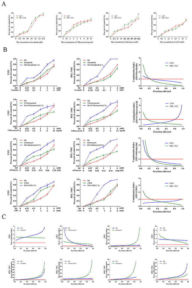 Figure 5: Combination treatment of MJ with sorafenib, 5-Fluorouracil, Adriamycin and 2-DG. (A) HCC cells (LM3 and BEL-7402) were treated with sorafenib (0–12.8 μM), 5-Fu (0–12 μg/mL), adriamycin (0–1.6 μM) and 2-DG (0–4 mM) for 48 h. (B) HCC cells were treated with these chemotherapeutics combined with MJ for 48 h. CI values were calculated at each Fa. (C) DRI was analyzed for the three drugs in HCC cells at each Fa. The CCK8 kit was used to monitor cell proliferation (n=3).