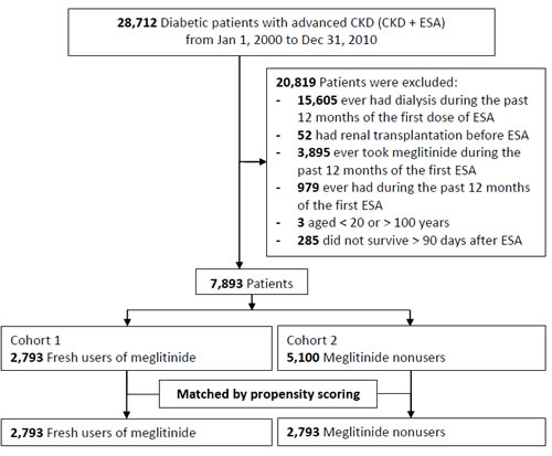 This study retrospectively included patients aged ≦ 20 years who had diagnosis codes for diabetes mellitus and CKD and received erythropoiesis-stimulating agent (ESA) treatment from January 1, 2000 to December 31, 2010. According to the NHI regulations, ESA can only be prescribed in anemic advanced CKD patients who have a hematocrit level of ≦ 28% and a serum creatinine level of > 6 mg/dL (equivalent to an estimated GFR of < 15 ml/min/1.73 m2) with the aim of maintaining a hematocrit level of 33-36%. We only included advanced CKD patients who were fresh users of meglitinides and who had no episode of hypoglycemia within one year prior to the first prescription of ESA. Patients who had been treated with dialysis (identified by procedure codes) or received renal transplantation before ESA and those who did not survive 90 days after the first ESA therapy were excluded.