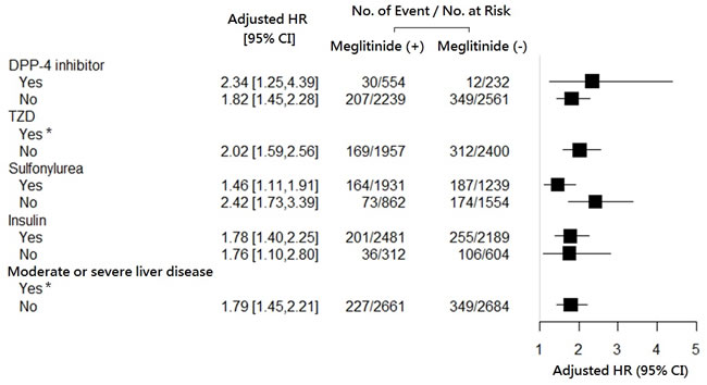 After adjustment for comorbidities, we also conducted an adjusted comparison of risks of meglitinide-associated hypoglycemia among patient subgroups stratified by the status of liver disease and concomitant use of other anti-diabetic agents.