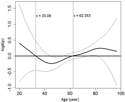 To evaluate the effect of age on the risk of hypoglycemia, we adopted a generalized additive model (GAM) with adjustment for baseline comorbidities and the status of anti-diabetic agent use. This method grants adjustment for possible nonlinear effects of continuous variables [31-33]. The result was shown as a function curve with values of the log odds ratio and was centered to have an average of zero over the range of the data. The approximate point-wise 95% CI was also depicted.