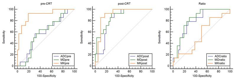 Where MKpre, MKpost, MDpre, MDpost, ADCpre, and ADCpost refer to MK, MD and ADC values before and after CRT,respectively.