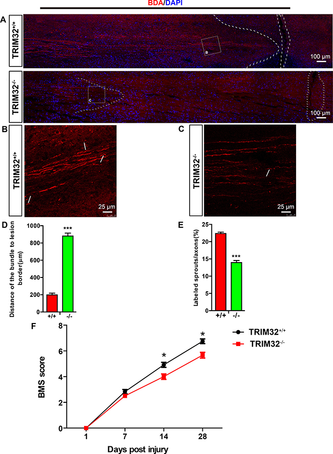 Figure 6: TRIM32–/– mice exhibited impaired axonal regeneration and behavioral recovery following spinal cord injury. (A–C) BDA-labeled CST in proximity of the lesion sites of TRIM32–/– and TRIM32+/+ mice following SCI for 28 days. Images with higher magnification were shown in B and C. Scale bars: 100 μm (A) 25 μm (B, C). (D) The distance of the sprouting axons to the lesion sites was quantified. (E) The numbers of sprouting axons were quantified and expressed as the percentage of total labeled CST. (F) BMS scores of TRIM32–/– and TRIM32+/+ mice following SCI at day 1, day 7, day 14 and day 28.