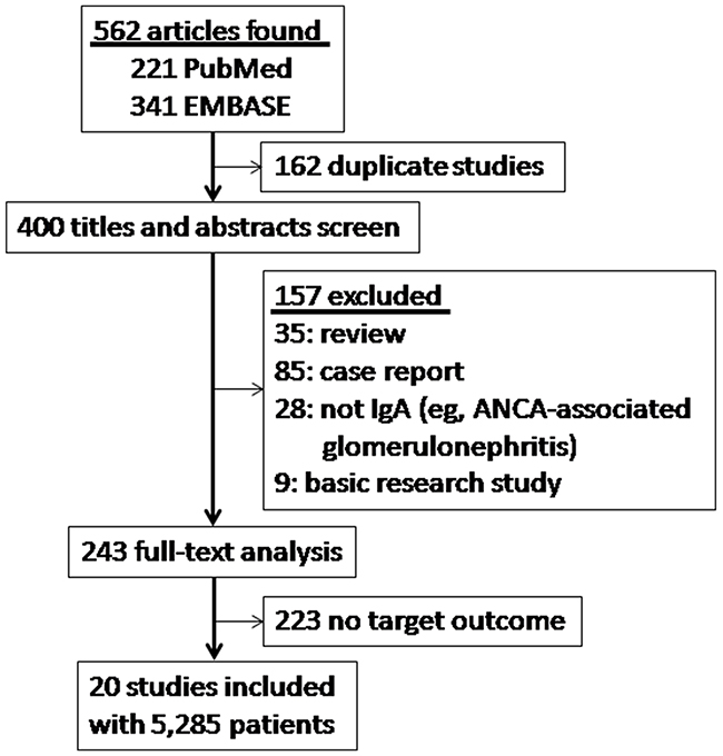 The PRISMA (Preferred Reporting Items for Systematic Reviews and Meta-analyses) was used as a guide in our study to ensure a standard approach for transparent and complete reporting of systematic reviews and meta-analyses [34]. Relevant studies were identified by searching PubMed and EMBASE (from January 2009 to July 2016) with medical subject heading terms and text words as follows in multiple combinations: “IGA Nephropathy,” “IGA Type Nephritis,” “Nephropathy, Immunoglobulin A,” “Immunoglobulin A Nephropathy,” “IGA Glomerulonephritis,” “Glomerulonephritides, IGA,” or “Berger Disease”; “Extracapillary proliferation,” “Extracapillary hypercellularity,” or “Crescent”. No language or region restrictions were imposed. In addition, other relevant studies were also identified through manual searches of the reference lists and bibliographies.