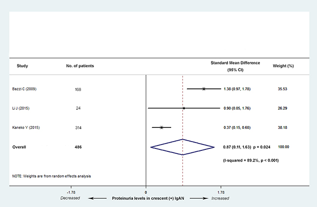 Figure 4: Standard mean differences (SMD) for the level of proteinuria for patients with versus without cellular/fibrocellular crescents. The IgAN patients with crescents had increased proteinuria levels (SMD, 0.87; 95% CI, 0.11-1.63; P = 0.024), with high heterogeneity (I2 = 89.2%; P < 0.001).