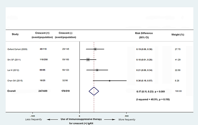 Figure 5: Risk differences (RD) for immunosuppressive therapy for patients with versus without cellular/fibrocellular crescents. The IgAN patients with crescents were more likely received immunosuppressive treatment (RD, 0.17; 95% CI, 0.11-0.23; P < 0.001), with no evidence of heterogeneity (I2 = 48.9%; P = 0.118).