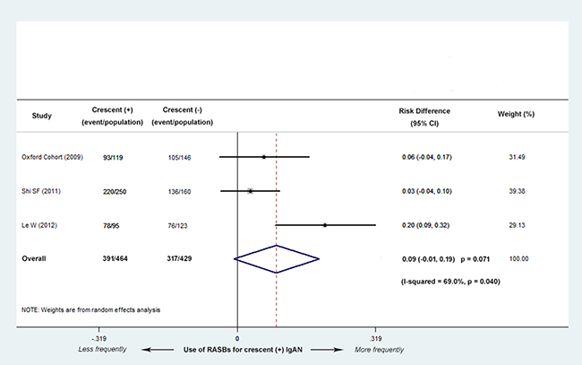 Figure 6: Risk differences (RD) for RASBs treatment for patients with versus without cellular/fibrocellular crescents. There were no significant differences in the use of RASBs between the two groups (RD, 0.09; 95% CI, -0.01-0.19; P = 0.071), with evidence of heterogeneity (I2 = 69.0%; P = 0.040).