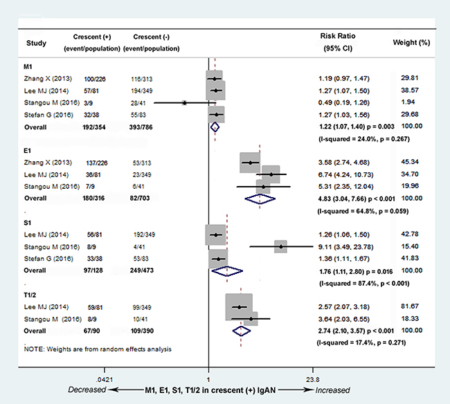 Figure 7: Risk ratios (RR) for other lesions for patients with versus without cellular/fibrocellular crescents. The numbers of patients with M1 (RR, 1.22; 95% CI, 1.07-1.40; P = 0.003), E1 (RR, 4.83; 95% CI, 3.04-7.66; P < 0.001), S1 (RR, 1.76; 95% CI, 1.11-2.80; P = 0.016), and T1/2 (RR, 2.74; 95% CI, 2.10-3.57; P < 0.001) were significantly larger in the IgAN patients with crescents, with no evidence of heterogeneity in M, E, T (M1, I2 = 24.0%; P = 0.267; E1, I2 = 64.8%; P = 0.059; I2 = 17.4%; P = 0.271), and high heterogeneity in S1 (I2 = 87.4%; P < 0.001). M1 defined as M score > 0.5, E1 defined as any E lesion present, S1 defined as any S lesion present, T1/2 defined as > 25% but < 50% and > 50% T lesion present.