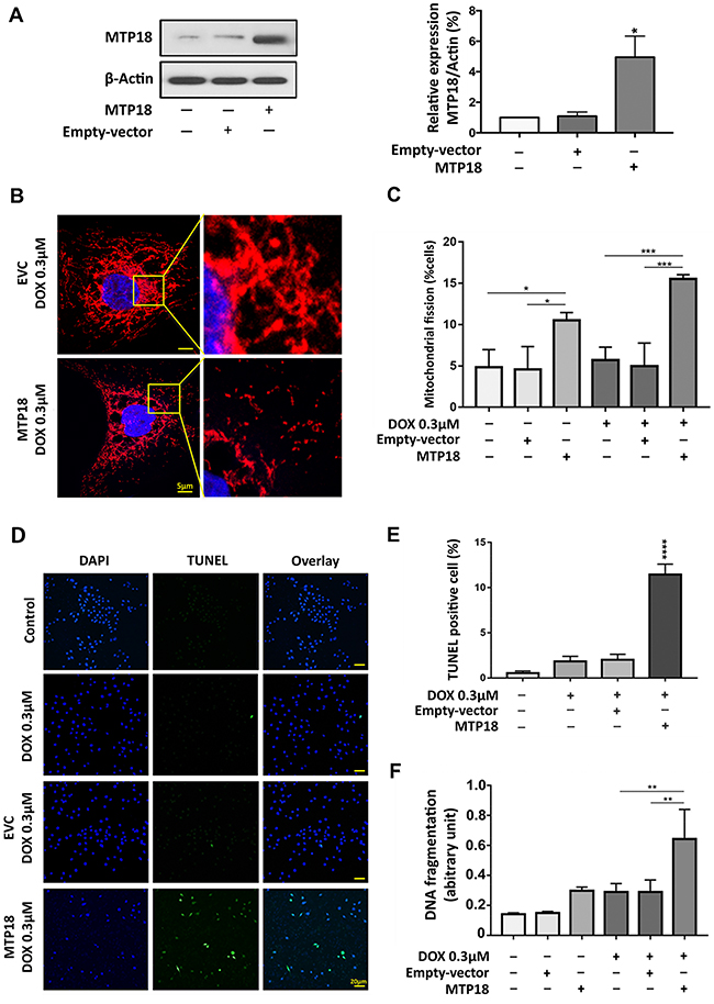 Figure 3: Enforced expression of MTP18 sensitizes doxorubicin-induced mitochondrial fission and apoptosis in AGS cells. (A) Analysis of MTP18 expression. Immunoblot shows mitochondrial protein 18 (MTP18) overexpression in AGS cells (left panel). β-actin served as a loading control. The densitometry data were expressed as the mean ± SEM of three independent experiments (right panel). *P<0.05 verses negative control or empty vector control (EVC). (B) and (C) Enforced expression of MTP18 sensitizes cells to undergo DOX-induced mitochondrial fission. AGS cells were exposed to low concentration DOX. B shows mitochondrial morphology. Bar=5μm. (C) Shows percentage of cells with mitochondrial fission; *P<0.05, and ***P<0.001. (D) and (E) Enforced expression of MTP18 sensitizes cells to undergo DOX-induced apoptosis. Apoptosis was analyzed by TUNEL assay. (D) Shows TUNEL positive cells. Bar=20μm. (E) Shows percentage of TUNEL positive cells. (F) Enforced expression of MTP18 sensitizes cells to undergo DOX-induced DNA fragmentation. DNA fragments were analyzed using the cell death detection ELISA. (D-F) AGS cells were exposed to low concentration (0.3μmol/L) DOX. **P<0.01, and ****P<0.0001 versus DOX alone or empty vector control treated with DOX. Data were expressed as the mean ± SEM of three independent experiments. Figures presented are the representative of at least three independent experiments.