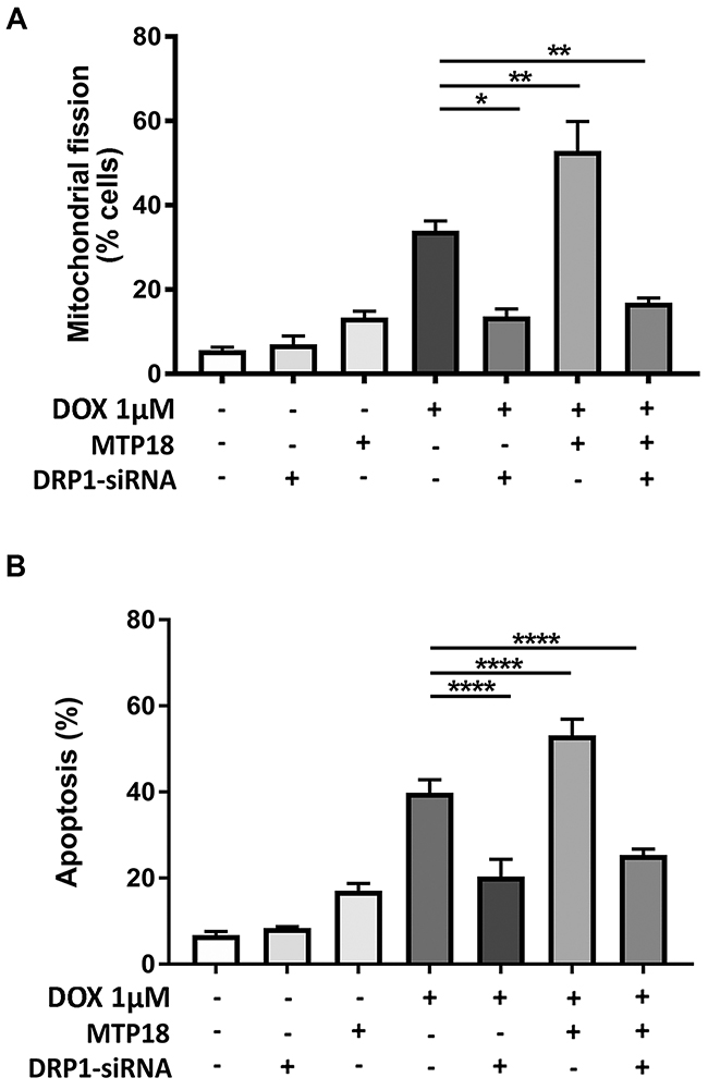 We then hypothesized whether MTP18 relies on DRP1 to exert its mitochondrial fragmentation and pro-apoptotic effects. To this end, we conducted a co-expression model using stable MTP18 overexpressed AGS cell line transfected with DRP1-siRNA. Then, we exposed different groups of cells to DOX. Our results showed that overexpression of MTP18 significantly increased DOX-induced mitochondrial fission and apoptosis. However, when DRP1 was knockdown in the presence of MTP18 overexpression, there was a significant reduction in percentages of cells undergoing mitochondrial fission (Figure 7A) and apoptosis upon high dose DOX exposure (Figure 7B), suggesting that MTP18 could not exert its pro-mitochondrial fission and pro-apoptotic effect when DRP1 is poorly expressed. These data suggest that MTP18-mediated mitochondrial fission and apoptosis is dependent on DRP1.