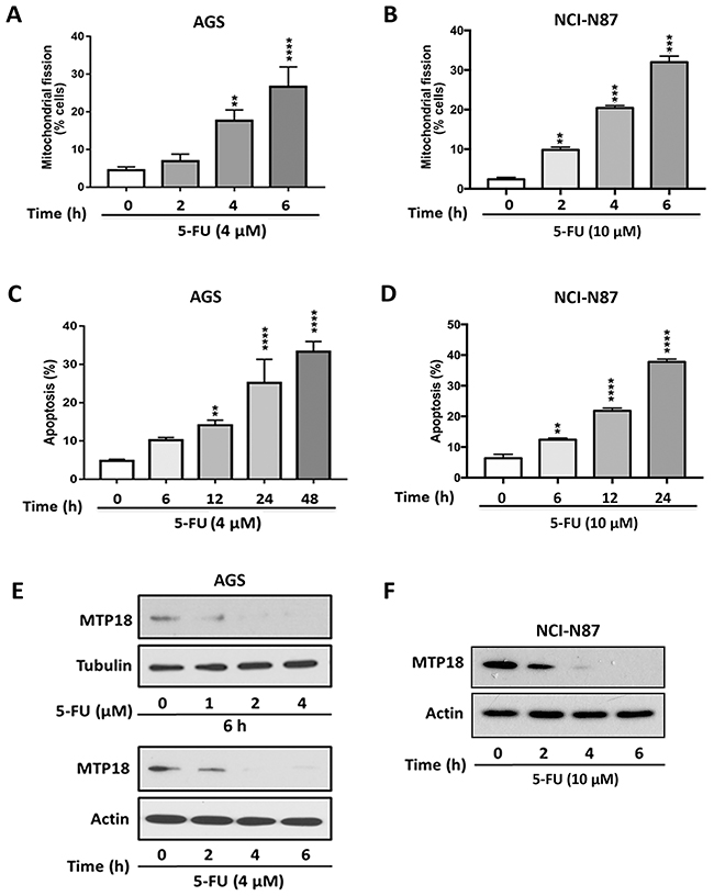 Figure 8: Fluorouracil treatment induces mitochondrial fission and apoptosis, and shows a similar trend of changes in MTP18 expression as doxorubicin exposure. (A) and (B) Fluorouracil (5-FU) induces mitochondrial fission in gastric cancer cells. (C) and (D) 5-FU induces apoptosis in gastric cancer cells. The cells were stimulated with 5-FU (4μmol/L) in AGS cell lines (A) and (C) or (10 μmol/L) in NCI-N87 cell lines (B) and (D) and then harvested at the indicated time for mitochondrial fission and apoptosis analysis. Percentage of apoptosis was analyzed by DNA fragmentation using the cell death detection ELISA. Data were expressed as the mean±SEM of three independent experiments. **P<0.01, ***P<0.001, and ****P<0.0001 compared to non-treated control. (E) and (F) 5-FU down regulates MTP18 expression in gastric cancer cells. (E) and (F) Show kinetics of MTP18 expression. AGS (E) and NCI-N87 (F) cell lines were stimulated with indicated dose of 5-FU and then harvested at the indicated time for immunoblotting. β-actin or tubulin served as a loading control.