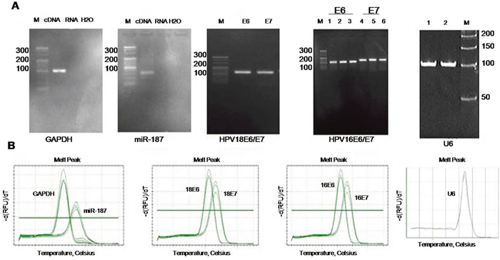 Figure 1: Specific analysis of each PCR primer. (A) Image shows 4% agarose electrophoresis of GAPDH, miR-187, HPV18 E6/E7, HPV16 E6/E7, and U6 PCR products. (B) Melting curves of GAPDH, miR-187, HPV18 E6/E7, HPV16 E6/E7, and U6 PCR products. M: 20-bp DNA marker.