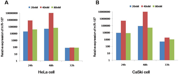 Figure 3: The best intervention time is 48 h and 40 nM of miR-187 mimics due to the maximum level of miR-187. Intervention times (24 h, 48 h, 72 h) and intervention concentrations (20 nM, 40 nM, 80 nM) of miR-187 in (A) HeLa cells and (B) CaSki cells.