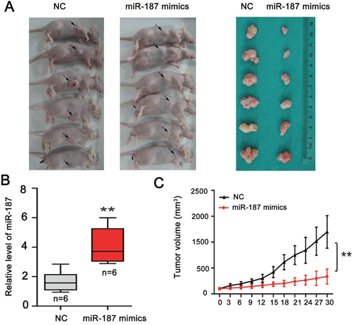 Figure 6: miR-187 overexpression inhibits tumor growth of CC in vivo. (A) Subcutaneous tumor transplantation experiment. (B) Detection of miR-187 levels in tumor tissues following treatment with miR-187 mimics or NC (**P < 0.01). (C) The tumor mass in the miR-187 mimics group was lower than that in the NC group (**P < 0.01).