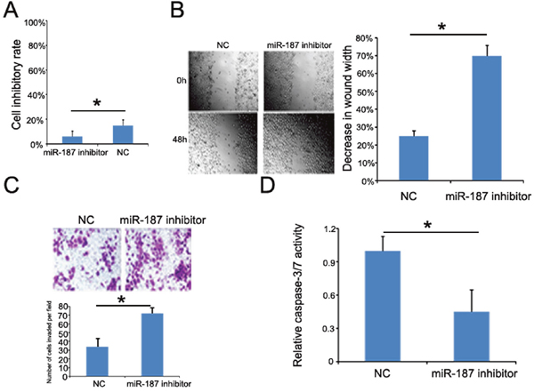 Figure 7: miR-187 knockdown promotes CaSki cell proliferation, migration, and invasion, and inhibits CaSki cell apoptosis. (A) CCK-8 detection of CaSki cell proliferation promoted by low miR-187 expression (*P < 0.05). (B) Wound healing assay of CaSki cells transfected with 40 nM miR-187 inhibitor or NC for 48 h. Bars represent the average percentage of wound healing ± SD (*P < 0.05). (C) Transwell chamber determination of CaSki cell invasive ability. Photos show representative fields of invasive cells on the membrane at ×200 magnification. Bar graphs represent the average number of cells per field on the underside of the membrane ± SD (*P < 0.05). (D) miR-187 inhibition decreased the caspase-3/-7 activity in CaSki cells. Bars represent the average percentage of caspase-3/-7 ± SD (*P < 0.05).