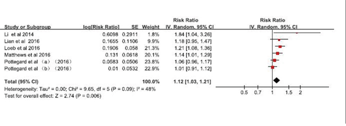 Five studies (one nested case-control study, one parallel case–control studies and three prospective cohort studies) were included in the meta-analysis. Three studies reported a positive association (i.e., RR >1.00), and two studies reported RR >1.00 but not statistically significant. Moderate heterogeneity was detected (P = 0.09, I2=0.48), and the multivariable-adjusted RR (95% CI) from the random-effects model was 1.12 (1.03-1.21; Figure 2).