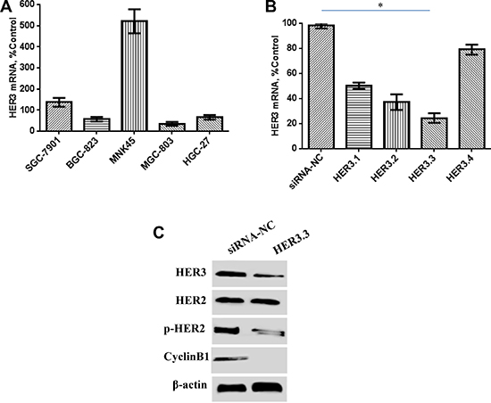 Figure 1: Effect of HER3 siRNA on the HER3 mRNA and protein levels. (A) HER3 mRNA expression is relatively high in human MKN45 GC cells, as detected by real-time PCR. (B) The HER3.3 siRNA construct is more effective than the other siRNA constructs. A non-silencing siRNA construct (control NS) was used as a control. The data represent the HER3 mRNA expression levels relative to that of GAPDH and are presented as the means ± SDs; *P < 0.05. (C) HER3.3 downmodulates HER3 protein expression in MKN45 cells. The knockdown of the HER3 level reduced the levels of activated HER2 (p-HER2), but not total HER2. HER3 knockdown in MKN45-HER3.3 cells also decreased Cyclin B1 expression.