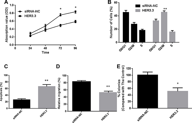 Figure 2: Downregulation of HER3 decreases cell proliferation and increases apoptosis. (A) Cell growth curves for MKN45-HER3-cs and MKN45-HER3.3 cells based on MTT assay results. (B) Comparison of cell cycle distributions between different groups. (C) TUNEL assay-based analysis of apoptosis in the indicated groups. (D) Comparison of the relative migration abilities between the indicated groups. E. Inhibition of MKN45 cell growth in soft agar by HER3.3. All of the data are shown as the means ± SDs from three experimental replications; *P < 0.05; **P < 0.01.