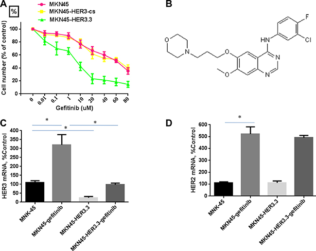 Figure 3: HER3 siRNA potentiates the effect of gefitinib. (A) Comparative growth inhibition rates of MKN45, MKN45-HER3-cs and MKN45-HER3.3 cells exposed to gefitinib. Control siRNA- and HER3.3-transfected MKN45 cells (2 × 103 cells/well) were grown in DMEM supplemented with 10% FBS in 96-well plates for 48 h and treated with various concentrations of gefitinib for 48 h. HER3.3 potentiates the effect of gefitinib on MKN45 cell growth, as determined by an MTT assay. The results represent the means ± SDs of three independent experiments. (B) Structure of gefitinib. Gefitinib treatment of MKN45 cells significantly induces HER3 (C) and HER2 (D) mRNA expression, and this induction is prevented by HER3.3 (C). Induction of HER2 expression by gefitinib is not prevented by HER3.3 (D). *P < 0.05 compared with control cells.