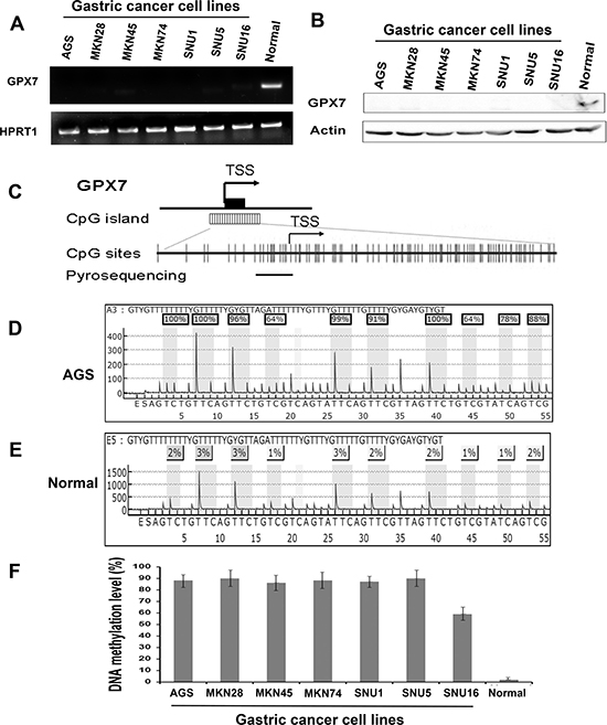 Figure 1: GPX7 is silenced and hypermethylated in gastric cancer cell lines. (A) qRT-PCR analysis of GPX7 gene expression in 7 gastric cancer cell lines and a normal gastric mucosa sample, showing undetectable GPX7 mRNA in all 7 gastric cancer cell lines examined. (B) Western blotting analysis of GPX7 protein in the 7 gastric cancer cell lines. (C) A schematic drawing shows a CpG island in GPX7 gene promoter, and pyrosequencing assay location. Each vertical bar represents a CpG site. TSS, transcription start site. DNA methylation level of 8 CpG sites in the GPX7 promoter was quantitated by pyrosequencing. (D) and (E) show representative pyrosequencing profiles of AGS and a normal gastric mucosa sample respectively. (F) Displays DNA methylation level of GPX7 promoter in the 7 gastric cancer cell lines, showing more than 50% methylation level in all the cell lines.