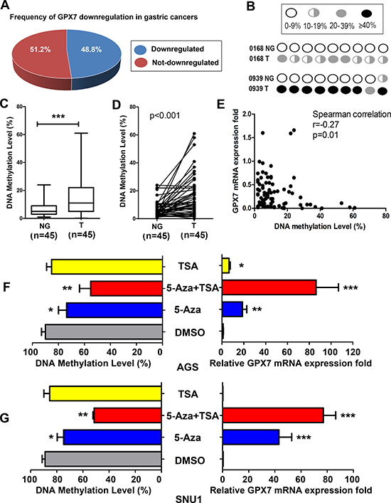 Figure 2: GPX7 is downregulated and hypermethylated in primary gastric cancers. (A) Downregulation of the GPX7 gene expression was found in 48.8% primary gastric cancer samples as compare to their matched normal samples from the same patients. (B) A schematic profile shows GPX7 methylation of the 8 CpG sites in 2 representative matched normal (NG) and tumor (T) samples. (C) Shows the average DNA methylation level of GPX7 promoter in 45 normal and 45 tumor samples. ***p < 0.001. (D) The DNA methylation level change of GPX7 promoter in 45 individual matched normal and tumor samples from the same patients is indicated (p < 0.001). (E) The Spearman rank correlation analysis between GPX7 promoter methylation and gene expression in all the samples, displays a reverse correlation between DNA methylation and gene expression (r = −0.27, p = 0.01). (F) and (G) show GPX7 gene expression and promoter methylation after 5-aza and/or TSA treatment in AGS (F) and SNU1 (G) cells. Relative GPX7 expression folds are shown in the right panels. DNA methylation levels of corresponding samples are shown on the left panels. 5-Aza, 5-Aza-2′ deoxycytidine. TSA, Trichostatin-A. DMSO, Dimethyl Sulfoxide. *p < 0.05, **p < 0.01, ***p < 0.001, as compared to DMSO control.