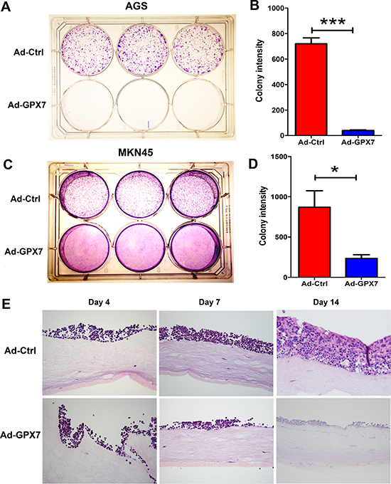 Figure 3: Reconstitution of GPX7 suppressed tumor cells growth. (A) and (B) Colony formation assay in AGS. Panel (B) shows quantitative data of (A) (***p < 0.001). (C) and (D) Colony formation assay in MKN45. Panel (D) shows quantitative data of (C) (*p < 0.05). (E) Organotypic 3D cell culture using MKN45 cells. Cells were harvested at day 4, 7 and 14. Results show HE staining of cells and display 3D (3-dimentional) structure. Tumor cells with GPX7 expression (Ad-GPX7) grew on the 3D culture at the beginning, but became much thinner at 1 week and finally died after 2 weeks, while control cells (Ad-ctrl) grew to form multiple layers at 2 weeks.