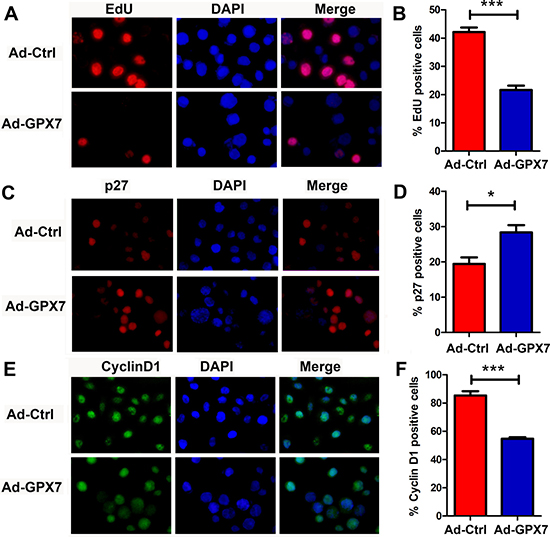 Figure 4: Reconstitution of GPX7 suppressed tumor cells proliferation in 2D culture. (A) EdU proliferation assay using AGS cells. Data shows GPX7-expressing cells (Ad-GPX7) had significantly lower EdU positive rate, meaning lower proliferation rate as compared to control cells (Ad-Ctrl). Right panel (B) shows quantitative data (***p < 0.001). (C) Immunocytochemistry staining of p27 protein using fluorescence. Data shows that GPX7-expressing cells (Ad-GPX7) had significantly higher p27 expression than control cells (Ad-Ctrl). Right panel (D) displays quantitative data (*p < 0.05). (E) Immunocytochemistry staining of Cyclin D1 protein using fluorescence. Data shows that GPX7-expressing cells (Ad-GPX7) had significantly lower Cyclin D1 expression as compared to control cells (Ad-Ctrl). Right panel (F) displays quantitative data (***p < 0.001).