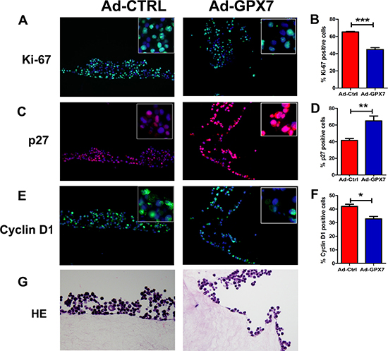 Figure 5: Reconstitution of GPX7 suppressed cancer cells proliferation in 3D organotypic culture. (A) Immunocytochemistry staining of Ki67 protein using fluorescence. Data shows that GPX7-expressing cells (Ad-GPX7) had significantly lower Ki67 expression as compared to control cells (Ad-Ctrl). Right panel (B) displays quantitative data (***p < 0.001). (C) Immunocytochemistry staining of p27 protein using fluorescence. Data shows that GPX7-expressing cells (Ad-GPX7) had significantly higher p27 expression as compared to control cells (Ad-Ctrl). Right panel (D) displays quantitative data (**p < 0.01). (E) Immunocytochemistry staining of Cyclin D1 protein using fluorescence. Data shows that GPX7-expressing cells (Ad-GPX7) had significantly lower Cyclin D1 expression as compared to control cells (Ad-Ctrl). Right panel (F) displays quantitative data (*p < 0.05). (G) and (H) show the HE images of organotypic culture corresponding to the fluorescence images.