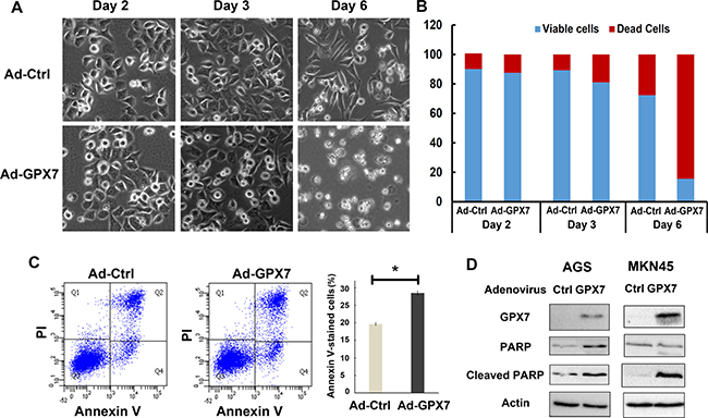 To determine if GPX7 can regulate cell death and contribute to suppression of gastric cancer cell growth, AGS cells were infected with control (Ad-Ctrl) and GPX7 (Ad-GPX7) adenovirus particles. We did not observe significant changes in cell morphology within 48 hours after infection. However, GPX7 expressing cells started to float at 72 hours and majority of cells were floating after six days (Figure 6A). Trypan blue assay confirmed that the floating cells were dead cells (Figure 6B). A similar observation was obtained with MKN45 cells (Supplementary Figure 2). Flow cytometry analysis of Annexin V showed that GPX7 expressing cells had a higher rate of Annexin V positive cells, as compared to control cells (Figure 6C, p < 0.05). To confirm this result, we carried out Western blotting analysis for cleaved PARP, a marker of apoptosis. As shown in Figure 6D, cells with reconstitution of GPX7 expression in AGS and MKN45 displayed significantly higher levels of cleaved PARP than control cells.