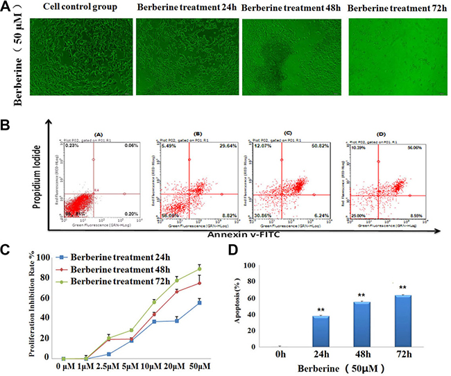 Figure 1: Berberine inhibited the proliferation and induced the apoptosis of 22RV1 human prostate cancer cells. (A) Berberine caused the cell morphological changes on 22RV1 human prostate cancer cells. (B) Different concentrations of berberine inhibited the proliferation of 22RV1 human prostate cancer cells for 24 h, 48 h, 72 h and the cell viability was determined by MTT assay. (C) 22RV1 human prostate cancer cells were treated with the concentrations of 50 μM berberine for 24 h, 48 h, 72 h and the cell apoptosis was analyzed with annexin V-FITC/PI staining.