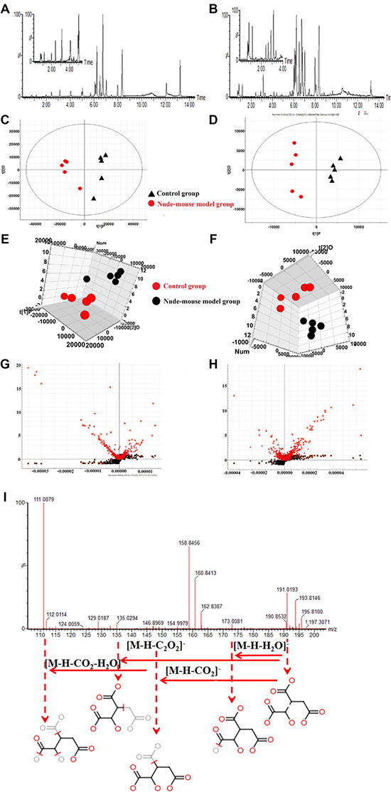 Figure 3: Serum metabolomics analysis. (A) UPLC-Q/TOF-MS/MS BPI serum chromatograms in positive mode; (B) UPLC-Q/TOF-MS/MS BPI serum chromatograms in negative mode; (C) PCA score plots for control and nude-mouse model group in positive mode; (D) PCA score plots for control and nude-mouse model group in negative mode; (E) 3D score plots of OPLS-DA based on serum metabolites discriminating control and nude-mouse model group in positive mode; (F) 3D score plots of OPLS-DA based on serum metabolites discriminating control and nude-mouse model group in negative mode; (G) Serum metabolite biomarkers in the VIP and S-plot between control and nude-mouse model group in positive mode; (H) Serum metabolite biomarkers in the VIP and S-plot between control and nude-mouse model group in negative mode; (I) Chemical structure and mass fragment information of isocitric acid in negative mode.